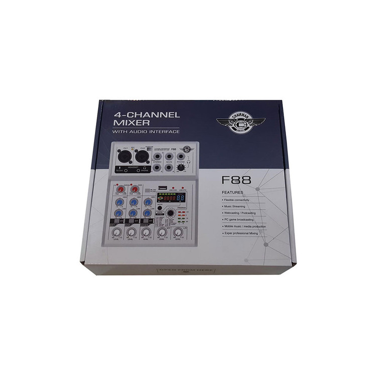 میکسر چیرمن مدل F88 دارای دو ورودی میکروفن و دو کانال ورودی استریو، مجهز به کلید فانتوم 48 ولت و افکت 88 کانال می باشد. این میکسر دارای ماژور پخش صوتی توسط درگاه USB و اتصال از طریق بلوتوث نیز هست.