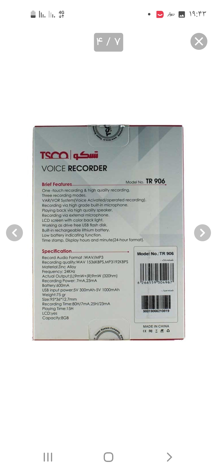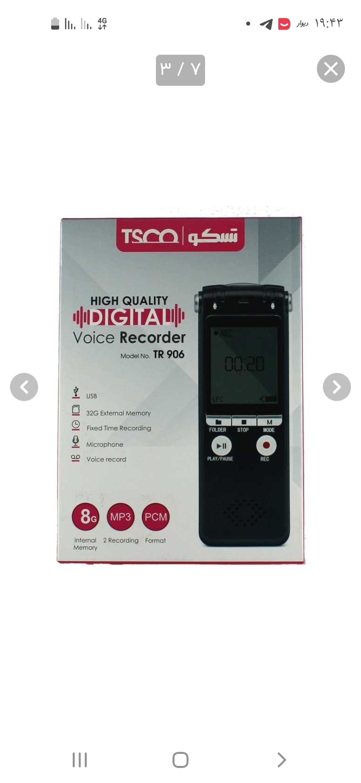 رکوردر و ضبط کننده صدا تسکو (Tsco) مدل TR 906 رنگ مشکی ویژگی ها ابعاد:۳۶×۹۵×۱۲.۷ سانتیمتر وزن:۷۵ گرم ظرفیت حافظه داخلی:۸ گیگابایت